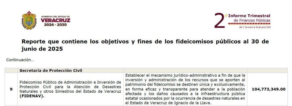 Ese fideicomiso, el FIDENAV, aparece en el Segundo Informe Trimestral de Finanzas Públicas, de 2025, del gobierno de Veracruz, con 104 millones 773 mil 349 pesos.