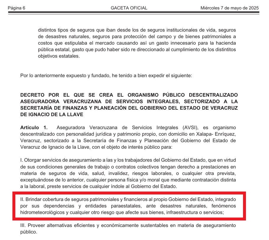 Después de que el gobierno del estado de Veracruz no renovase las pólizas de los seguros contra desastres, el 7 de mayo de 2025 se emitió el decreto por el que se creaba la Aseguradora Veracruzana de Servicios Integrales (AVSI), la cual entre sus objetivos tiene el de dar cobertura a las instituciones del gobierno del estado “ante desastres naturales, fenómenos hidrometeorológicos y cualquier otro riesgo que afecte sus bienes, infraestructura o servicios” (SIC).