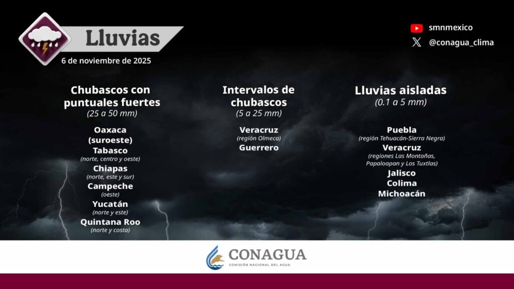 Pronostica chubascos con lluvias puntuales fuertes (de 25 a 50 mm) en Oaxaca (suroeste), Tabasco (norte, centro y oeste), Chiapas (norte, este y sur), Campeche (oeste), Yucatán (norte y este) y Quintana Roo (norte y costa).