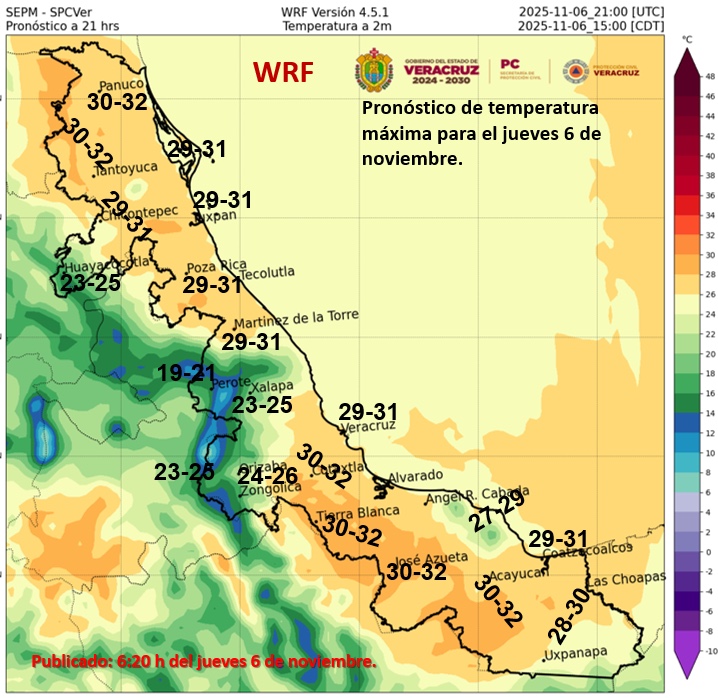 Las temperaturas máximas irán de 35 a 40 °C en Baja California Sur, Sonora, Chihuahua (suroeste), Coahuila, Durango (oeste), Sinaloa, Nayarit, Jalisco, Colima, Michoacán, Guerrero, Oaxaca y Chiapas (costa).