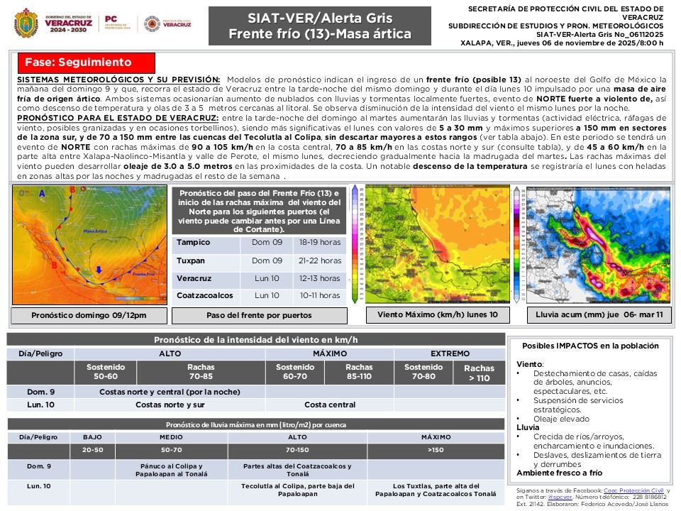 Cielo medio nublado a nublado con lluvias puntuales fuertes en Tabasco (norte, centro y oeste), las cuales podrían originar el incremento en los niveles de ríos y arroyos, deslaves, inundaciones, encharcamientos y visibilidad reducida; así como chubascos en Veracruz (región Olmeca) y lluvias aisladas en las regiones Las Montañas, Papaloapan y Los Tuxtlas de dicho estado. Cielo despejado a parcialmente nublado y sin lluvia en Tamaulipas. Por la mañana, ambiente frío a fresco con bancos de niebla en la región, y muy frío con posibles heladas en zonas montañosas de Veracruz. Durante la tarde, ambiente templado a cálido. Viento de componente este de 10 a 20 km/h en la región, con rachas de 35 a 50 km/h en Tamaulipas.