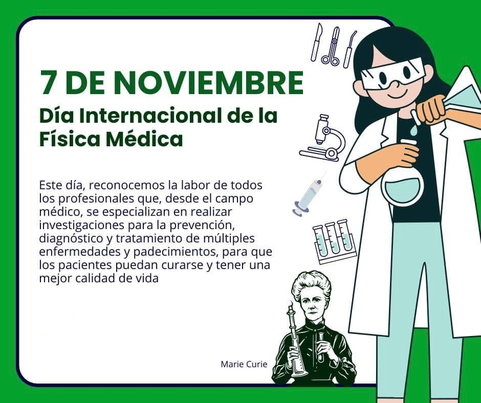 El 7 de noviembre se celebra el Día Internacional de la Física Médica, coincidiendo con el natalicio de Marie Curie, una reconocida científica que fue la pionera en lograr grandes avances en el campo de la radiactividad y cuyo trabajo se ha convertido en un gran aporte para tratar enfermedades como el cáncer y otras.