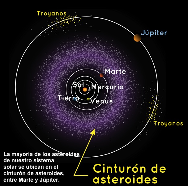 Los asteroides son más pequeños que los planetas, pero más grandes que los meteoroides, que tienen el tamaño de un pedazo de roca. La mayoría de los asteroides en nuestro sistema solar se encuentran en el cinturón de asteroides, una región situada entre Marte y Júpiter. Pero también pueden pasar por otros lugares alrededor del sistema solar. Por ejemplo, algunos asteroides orbitan alrededor del Sol en un camino que los lleva cerca de la Tierra.