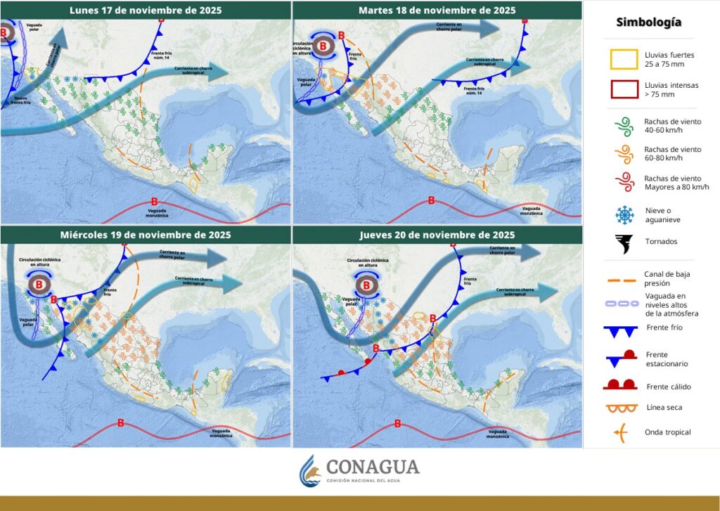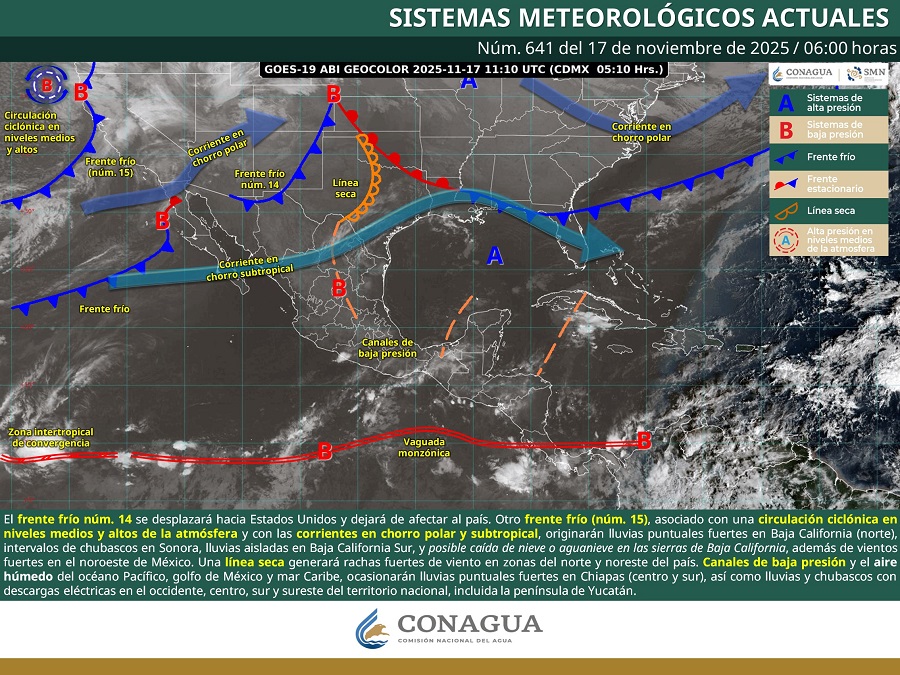 Para hoy, la CONAGUA prevé que el frente frío número 14 se desplace hacia Estados Unidos y deje de afectar al país.