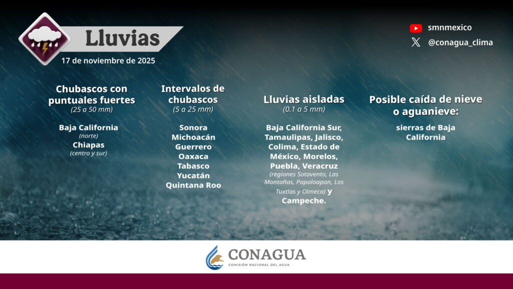 Además, lluvias aisladas en Baja California Sur con posible caída de nieve o aguanieve en las sierras de Baja California, además de vientos fuertes en el noroeste de México.