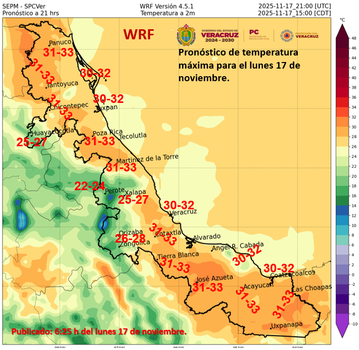 Las temperaturas máximas irán de 35 a 40 °C en Sinaloa, Nayarit, Jalisco, Colima, Michoacán, Guerrero, Oaxaca (istmo), Chiapas, Coahuila, Nuevo León, Tamaulipas y San Luis Potosí.