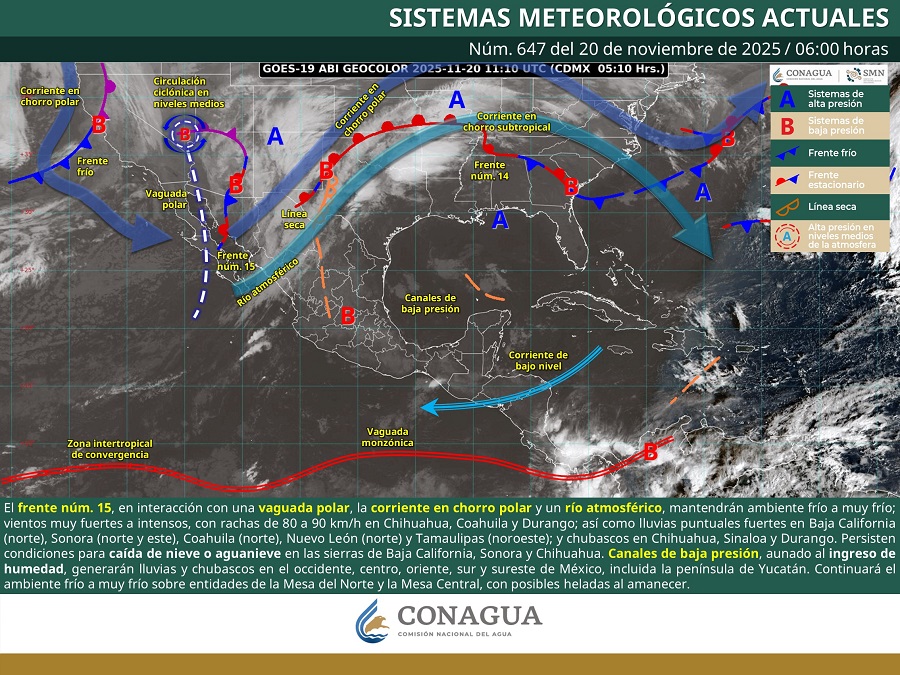 Este día, el frente número 15 se desplazará sobre el norte y noreste del país, en interacción con una vaguada polar, la corriente en chorro polar y un río atmosférico.