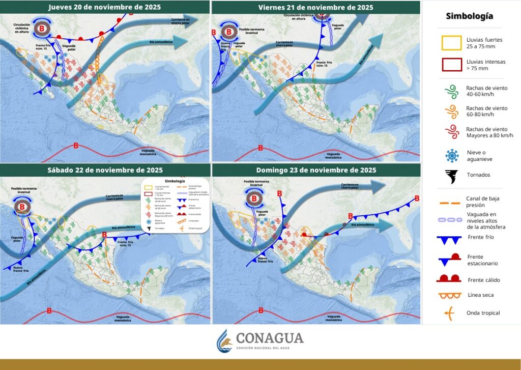 Lo anterior, informa la CONAGUA, mantendrá ambiente frío a muy frío; vientos muy fuertes a intensos, con rachas de 80 a 90 km/h en Chihuahua, Coahuila y Durango.