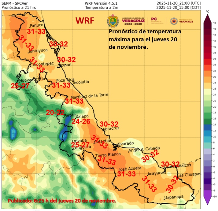 Las máximas de 30 a 35 °C en Nuevo León, Tamaulipas, Durango, San Luis Potosí, Morelos, Puebla (suroeste), Veracruz, Tabasco, Campeche, Yucatán y Quintana Roo.