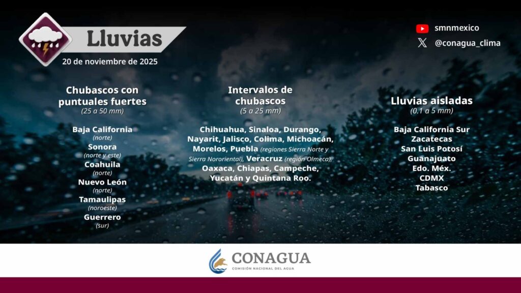 Pronostica chubascos con lluvias puntuales fuertes (de 25 a 50 mm) en Baja California (norte), Sonora (norte y este), Coahuila (norte), Nuevo León (norte), Tamaulipas (noroeste) y Guerrero (sur).