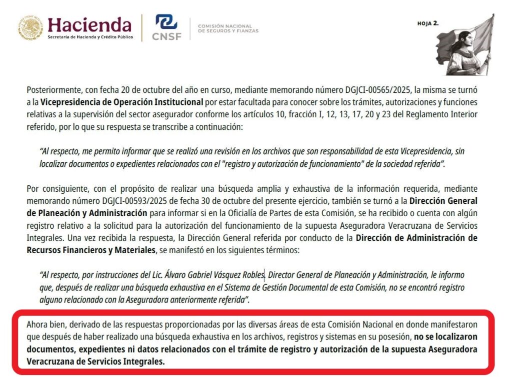 La Comisión Nacional de Seguros y Fianzas, que es la que tiene facultades para autorizar la operación de instituciones o sociedades mutualistas de seguros, en respuesta a una solicitud de acceso a la información informó que «después de una búsqueda exhaustiva en los archivos, registros y sistemas con los que cuenta esta Comisión, no se encontró información ni dato alguno del que se desprenda que «Aseguradora Veracruzana de Servicios Integrales», cuente con autorización para operar como institución o sociedad mutualista de seguros».