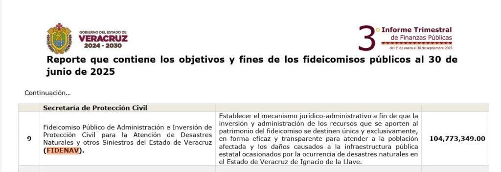 Pero además, el FIDENAV, según se asienta en el Tercer Informe Trimestral de las Finanzas Públicas del gobierno de Veracruz, de este año, tiene 104 millones de pesos, nada más.