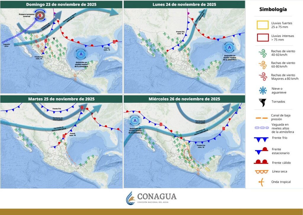 Añade que el frente frío número 16 recorrerá el norte del territorio nacional e interaccionará con una vaguada polar, originando chubascos y rachas de vientos fuertes a muy fuertes en Sonora, Chihuahua y Coahuila.