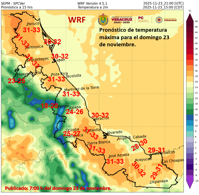 Las máximas de 30 a 35 °C en Baja California Sur, Sonora, Sinaloa, Chihuahua (suroeste), Coahuila, Durango (noroeste), Tamaulipas (suroeste), Nayarit, Jalisco, Colima, Michoacán, Chiapas (istmo y costa), Puebla (suroeste) y Campeche.