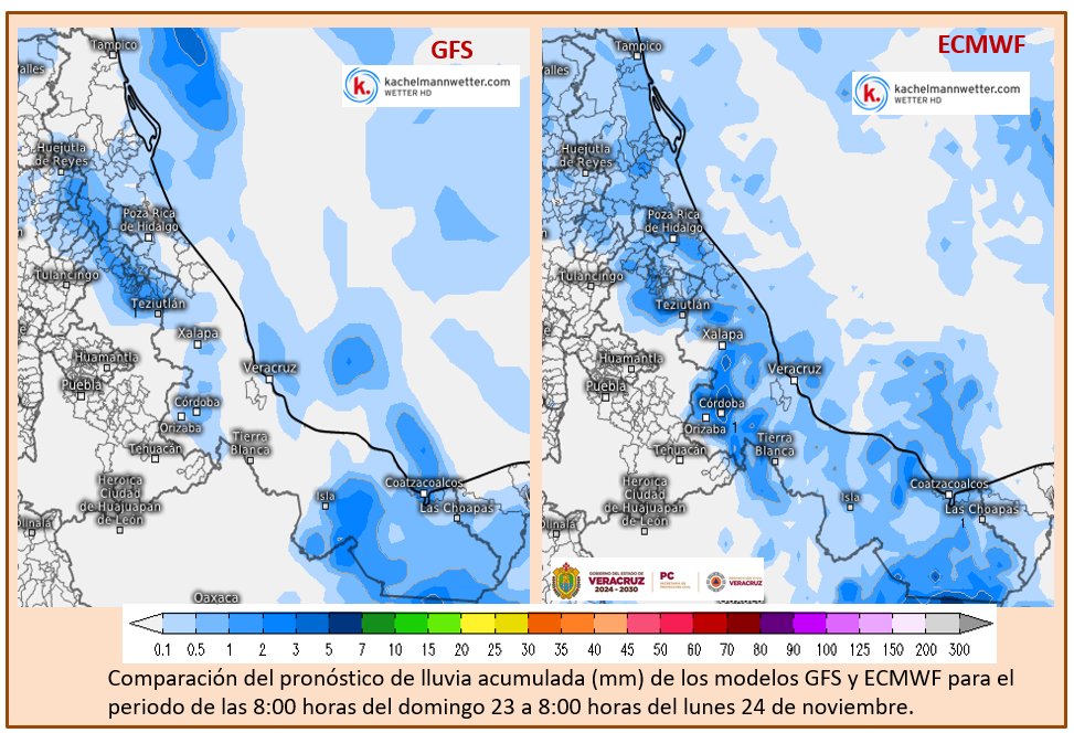 Pronostica intervalos de chubascos (de 5 a 25 mm) en Sonora, Chihuahua, Coahuila, Nuevo León, Tamaulipas, Veracruz (regiones Los Tuxtlas y Olmeca), Jalisco, Colima, Michoacán, Guerrero, Oaxaca, Chiapas y Quintana Roo.