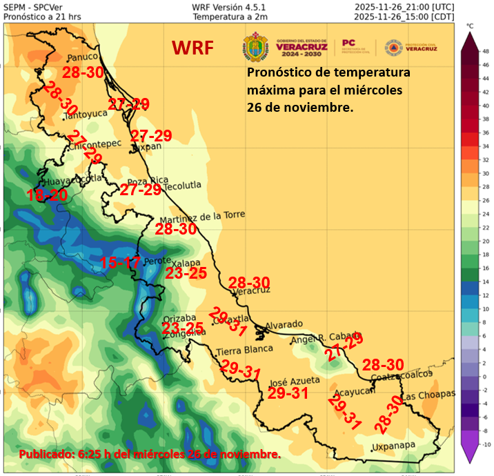 En el transcurso del día, cielo medio nublado a nublado. Por la mañana, bancos de niebla en sierras de la región, ambiente fresco a templado, y frío en la zona montañosa de Veracruz. Durante la tarde, ambiente cálido; lluvias puntuales intensas en Veracruz (regiones Huasteca Baja, Totonaca, Nautla y Capital); muy fuertes en Veracruz (regiones Huasteca Alta, Papaloapan, Las Montañas, Los Tuxtlas y Olmeca) y Tamaulipas, así como fuertes en Veracruz (región Sotavento) y Tabasco; las cuales podrían acompañarse con descargas eléctricas, y originar el incremento en los niveles de ríos y arroyos, deslaves, inundaciones, encharcamientos y visibilidad reducida. Evento de “Norte” de 20 a 30 km/h con rachas de 40 a 60 km/h en Tamaulipas y Veracruz, y viento de dirección variable con rachas de 40 a 60 km/h en Tabasco. Oleaje de 1.0 a 2.0 metros de altura en costas de Tamaulipas y Veracruz.