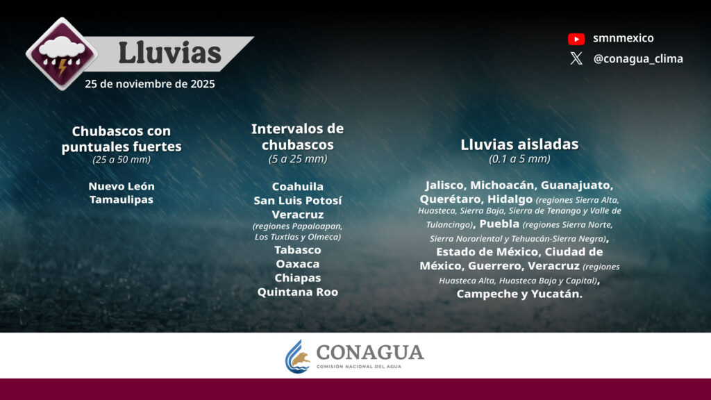 Intervalos de chubascos (de 5 a 25 mm) en Coahuila, Zacatecas, Guanajuato, Estado de México, Ciudad de México, Tlaxcala, Campeche, Yucatán y Quintana Roo.