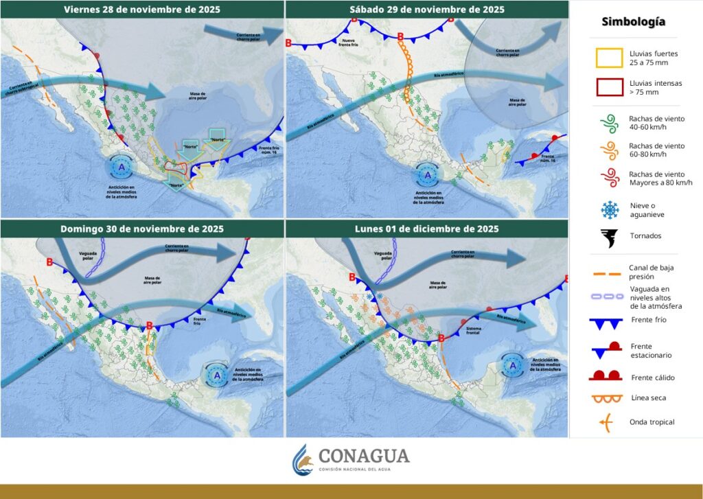 Asimismo, añade, la masa de aire polar asociada al frente mantendrá el evento de “Norte” con rachas de viento de 60 a 80 km/h en Oaxaca y Chiapas (istmo y golfo de Tehuantepec).