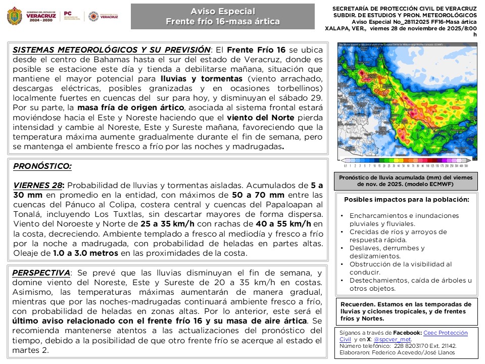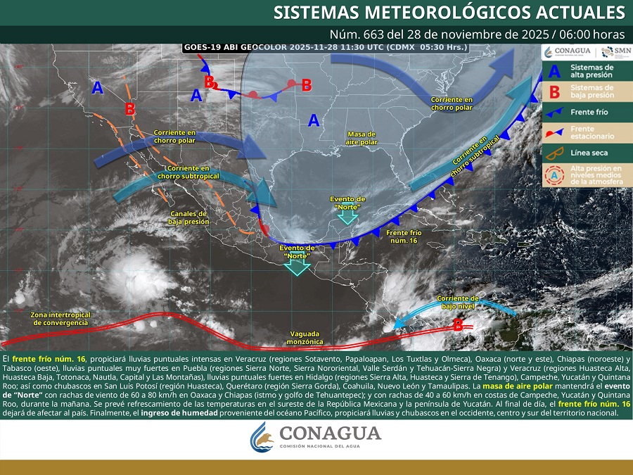 Este día, el frente frío 16 se extenderá sobre la península de Yucatán y sureste de México y propiciará lluvias puntuales intensas en Veracruz (regiones Sotavento, Papaloapan, Los Tuxtlas y Olmeca).