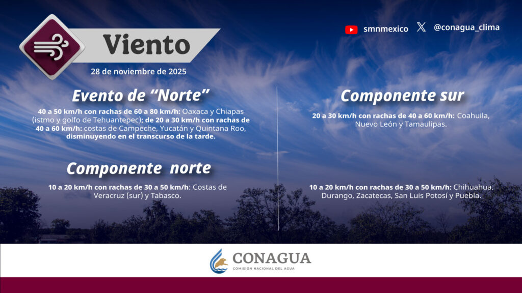 Prevé evento de “norte” de 40 a 50 km/h con rachas de 60 a 80 km/h en Oaxaca y Chiapas (istmo y golfo de Tehuantepec).