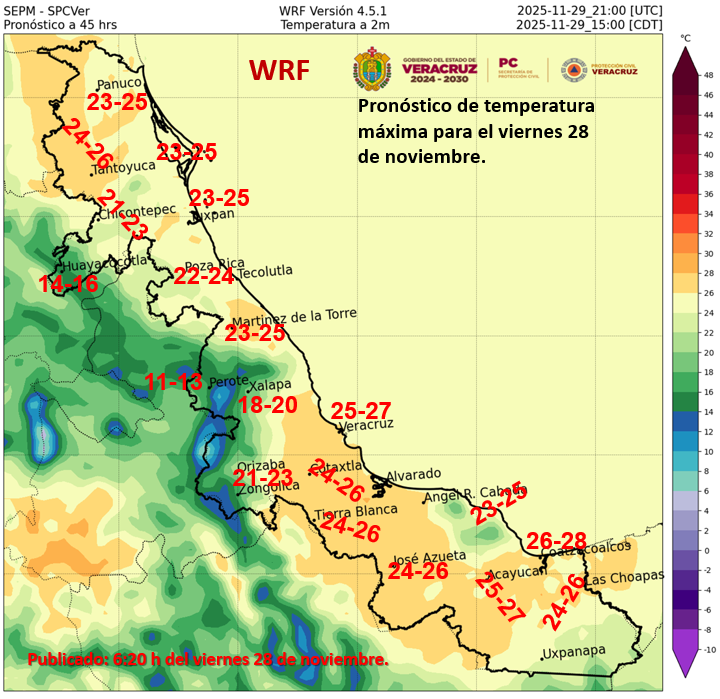Durante el día, cielo medio nublado a nublado con lluvias puntuales intensas en Veracruz (regiones Sotavento, Papaloapan, Los Tuxtlas y Olmeca) y Tabasco (oeste), lluvias puntuales muy fuertes en Veracruz (regiones Huasteca Alta, Huasteca Baja, Totonaca, Nautla, Capital y Las Montañas); todas acompañadas con descargas eléctricas, y podrían originar encharcamientos, inundaciones y deslaves, así como incremento en los niveles de ríos y arroyos. Se prevén chubascos con posibles descargas eléctricas en Tamaulipas. Por la mañana, ambiente frío con heladas en zonas altas de Veracruz, y fresco a templado en el resto de la región. Bancos de niebla. Durante la tarde, ambiente templado a cálido. Viento de componente norte de 10 a 20 km/h con rachas de 30 a 50 km/h en costas de Veracruz (sur) y Tabasco, y viento de componente sur de 20 a 30 km/h con rachas de 40 a 60 km/h en Tamaulipas. Se prevé oleaje de 1.5 a 2.5 metros de altura en costas de Tamaulipas, Veracruz y Tabasco.