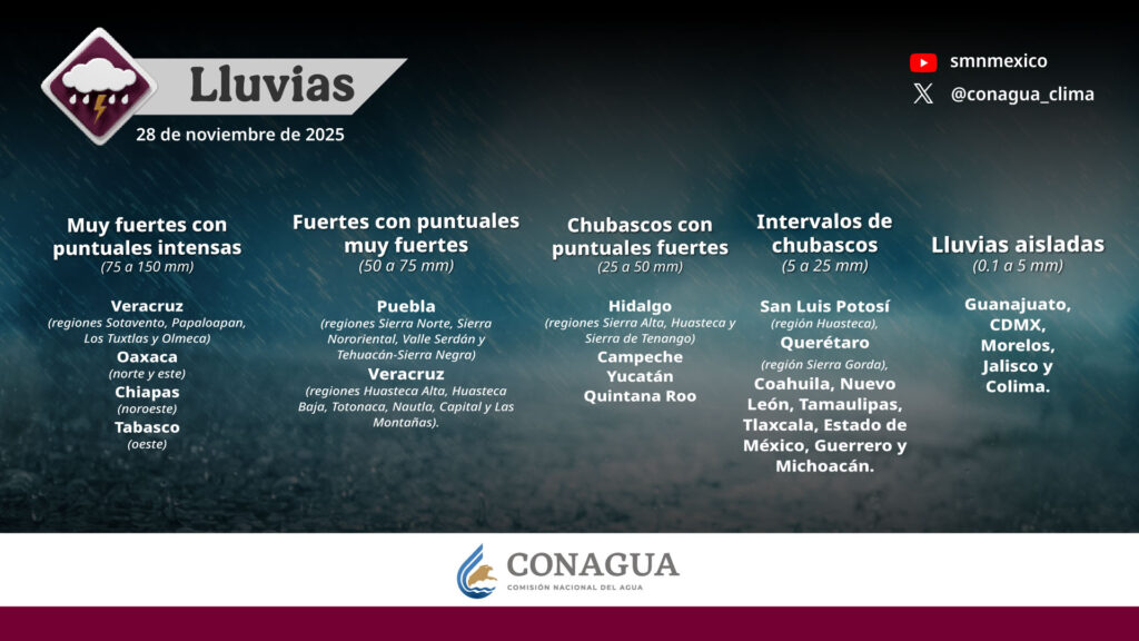 Asimismo, informa la CONAGUA, lluvias en Oaxaca (norte y este), Chiapas (noroeste) y Tabasco (oeste), y lluvias puntuales muy fuertes en Puebla (Sierra Norte, Sierra Nororiental, Valle Serdán y Tehuacán-Sierra Negra).