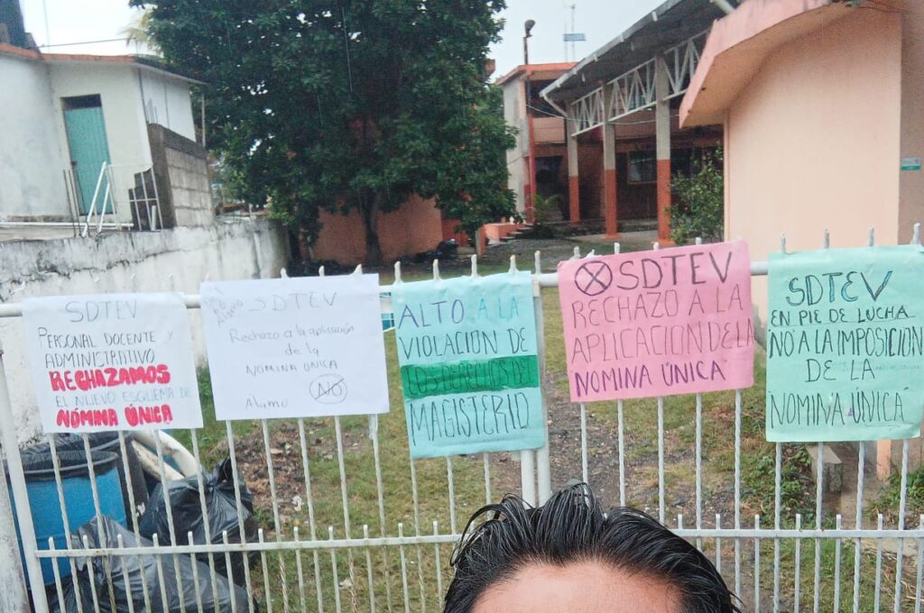 Agremiados del Sindicato Democrático de Trabajadores de la Educación de Veracruz (SDTEV) tomaron diferentes escuelas de los niveles de Preescolar, Primaria, Secundaria y Bachillerato desde el norte, centro y sur del Estado de Veracruz, en protesta por la implementación de la nómina única por parte del gobierno estatal, a través de la Secretaría de Educación de Veracruz (SEV).