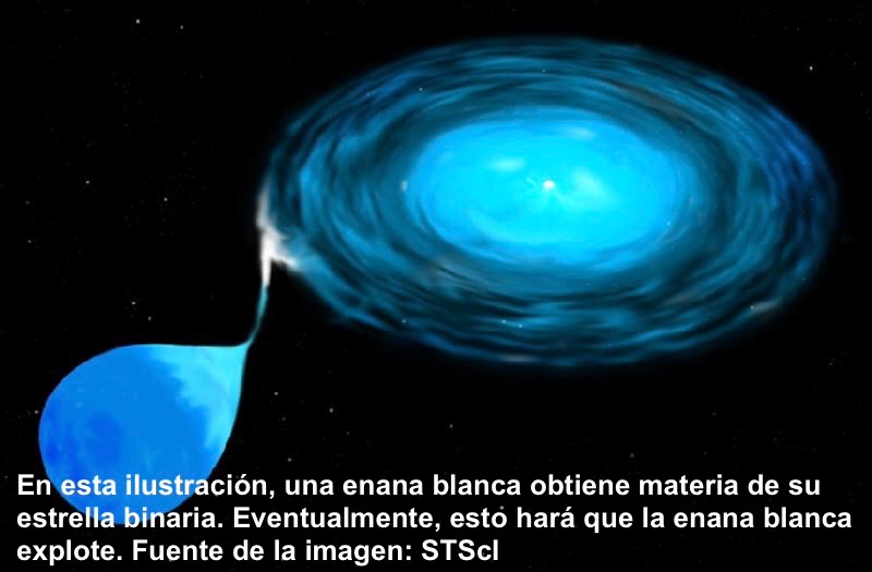 Hay un segundo tipo de supernova que puede tener lugar en sistemas en los que hay dos estrellas que orbitan entre sí, y al menos una de esas estrellas es una enana blanca del tamaño de la Tierra. Una enana blanca es lo que queda después de que una estrella del tamaño de nuestro Sol se haya quedado sin combustible. Si una enana blanca choca con otra o extrae demasiada materia de su estrella cercana, la enana blanca puede explotar. ¡Bum!