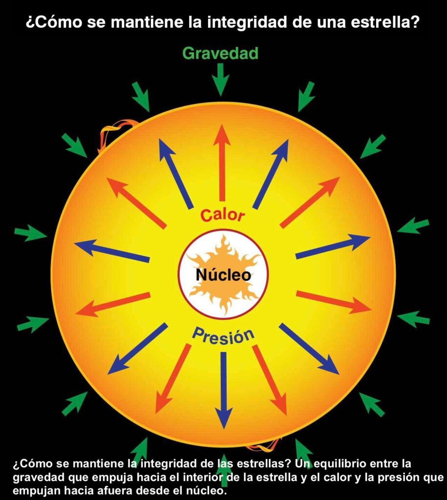 Las estrellas mantienen el equilibrio entre dos fuerzas opuestas. La gravedad de la estrella intenta compactar la estrella, para que sea la bola más pequeña y densa posible. Pero el combustible nuclear que se quema en el núcleo de la estrella genera una fuerte presión hacia el exterior. Este empuje hacia afuera crea resistencia ante la compresión hacia adentro de la gravedad.