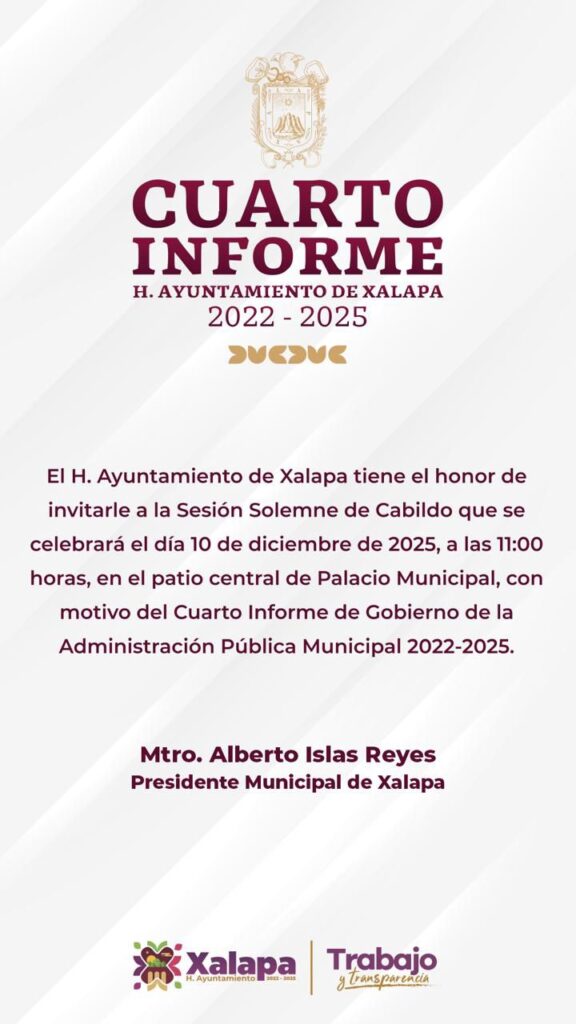 En cumplimiento a los ordenamientos legales y los principios de transparencia y rendición de cuentas, el próximo 10 de diciembre, a las 11:00 horas, el alcalde Alberto Islas Reyes rendirá el Cuarto Informe del Estado que Guarda la Administración Pública Municipal 2022-2025.