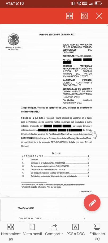 En la sentencia emitida por este organismo jurisdiccional determinó la existencia de Violencia Política contra las Mujeres en Razón de Género ejercida en contra de la actual diputada local panista, durante el ejercicio de sus funciones como Secretaria de Promoción Política de la Mujer del Partido Acción Nacional en Veracruz.