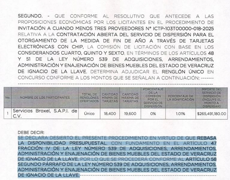 Cuando digo que el Gobierno ya no tiene dinero me baso en una nota de mi compañera reportera Isabel Ortega, quien publicó el sábado en el periódico digital La Silla Rota Veracruz que, de acuerdo al portal de la Secretaría de Salud, a partir del pasado 5 de noviembre se emitió una invitación a por lo menos tres empresas para presentar propuestas económicas para la adquisición de entre 18 mil 400 y 19 mil 600 tarjetas o vales electrónicos para igual número de trabajadores, proceso que, finalmente, el 10 de diciembre, fue declarado desierto por falta de suficiencia presupuestal. Isabel publicó una copia facsimilar del documento respectivo.