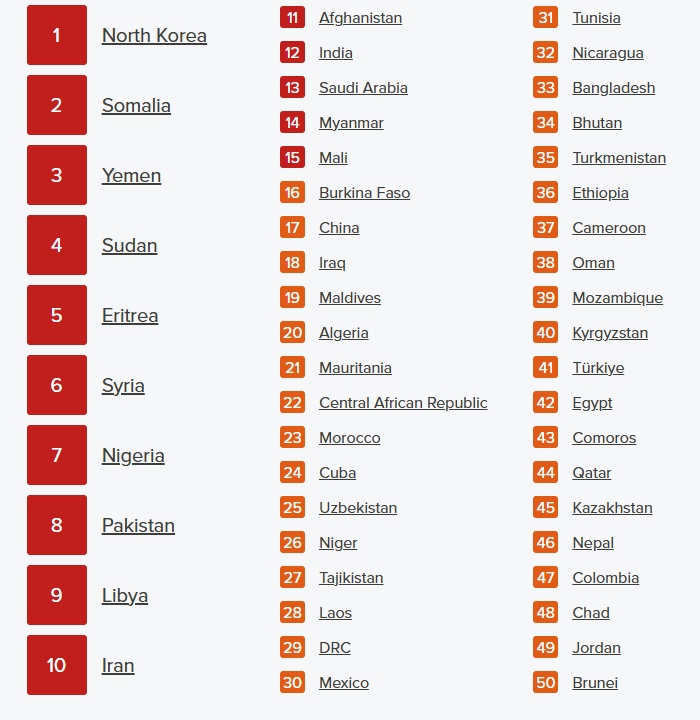 Le siguen Somalia y Yemen, ilustrando el dominio del islamismo radical que no tolera la disidencia religiosa.
