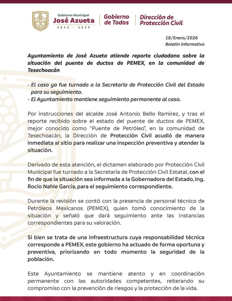 Ante este escenario, los habitantes de Tesechoacán exhortaron de manera firme y urgente a PEMEX y al presidente municipal de José Azueta, para que ordenen de inmediato una inspección técnica especializada, implementen medidas preventivas de Protección Civil y ejecuten acciones de reforzamiento o reconstrucción, conforme a los dictámenes correspondientes.