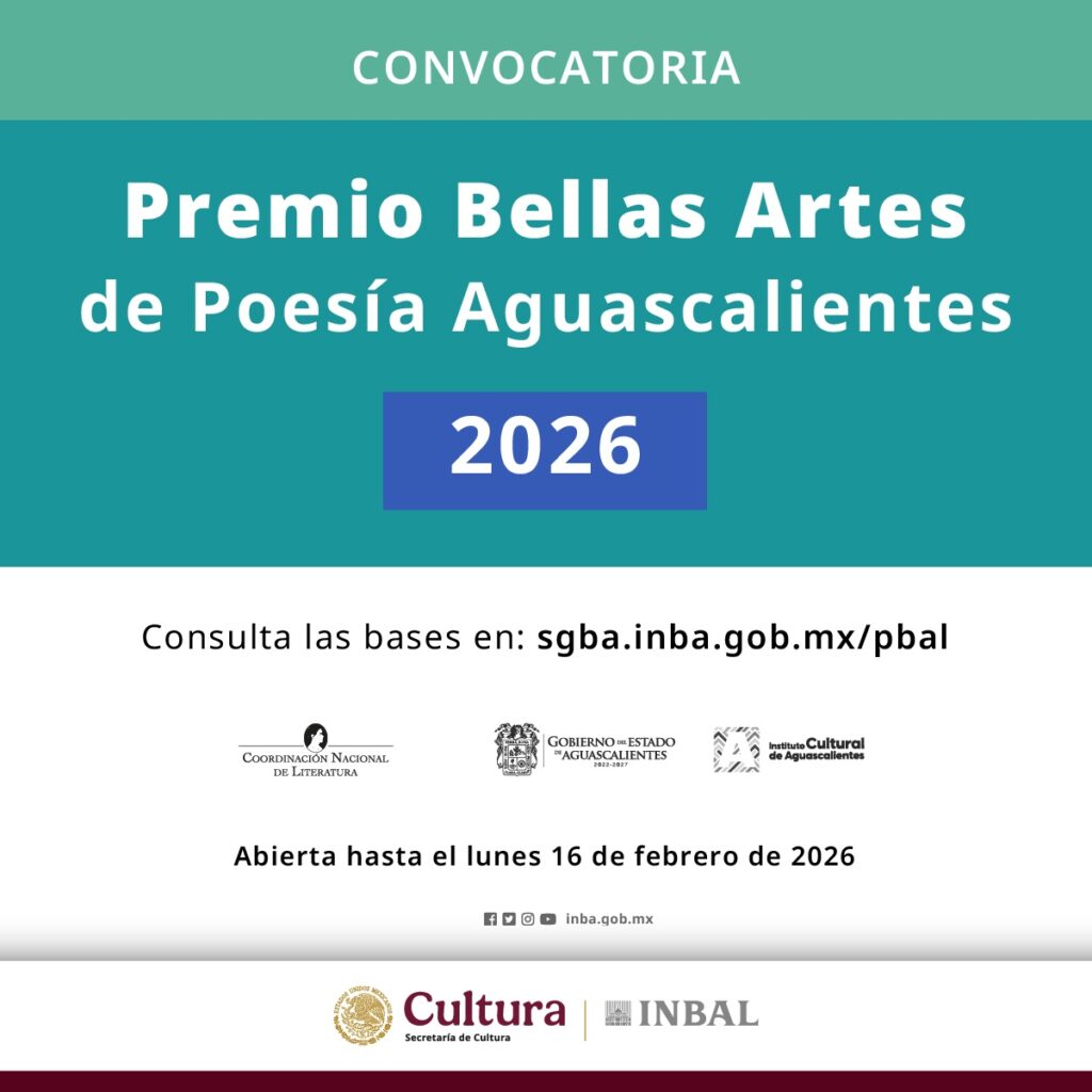La Secretaría de Cultura del Gobierno de México y el Instituto Nacional de Bellas Artes y Literatura (INBAL), a través de la Coordinación Nacional de Literatura (CNL), en colaboración con el Gobierno del Estado de Aguascalientes, mediante el Instituto Cultural de Aguascalientes (ICA), convocan al Premio Bellas Artes de Poesía Aguascalientes 2026.Podrán participar personas escritoras […]