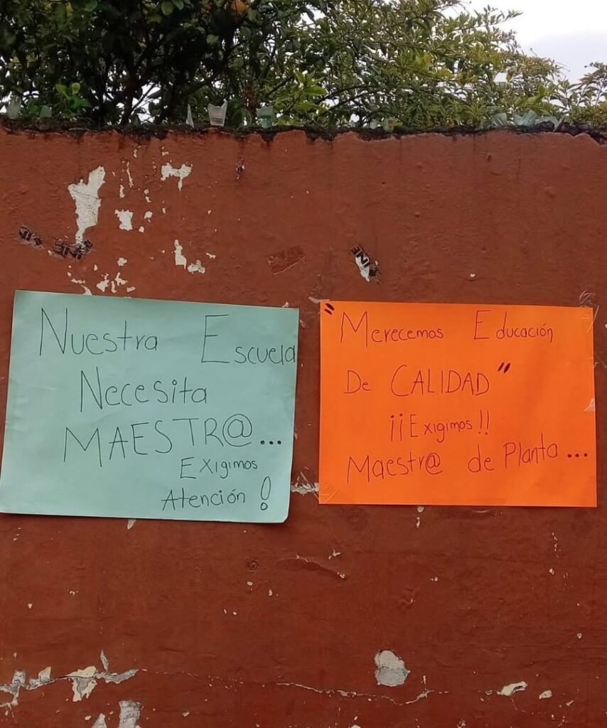 Cómo parte de su protesta, los padres colocaron cartulinas en la entrada principal de este centro educativo, además de portar en sus manos otras cartulinas con varias consignas en las que exigen manden a los dos docentes frente a grupo.