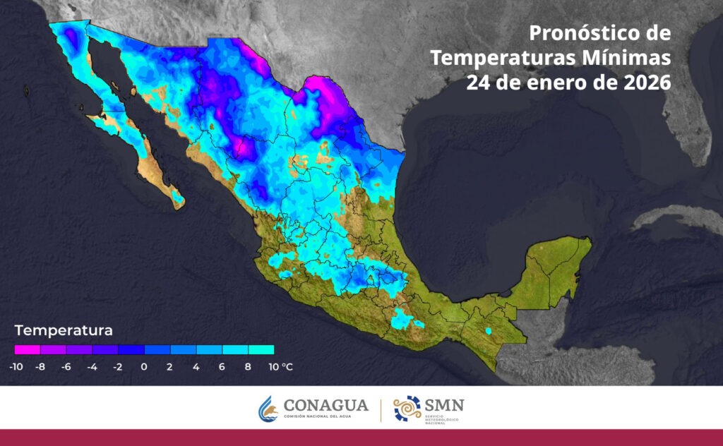 Las temperaturas mínimas irán de -10 a -5 °C con heladas en zonas serranas de Chihuahua y Durango.
