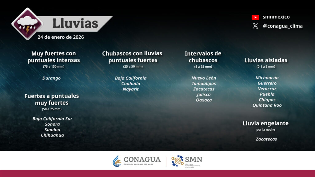 Pronostica lluvias muy fuertes con puntuales intensas (de 75 a 150 mm) en Durango; y lluvias fuertes con puntuales muy fuertes (de 50 a 75 mm) en Baja California Sur, Sonora, Sinaloa y Chihuahua.