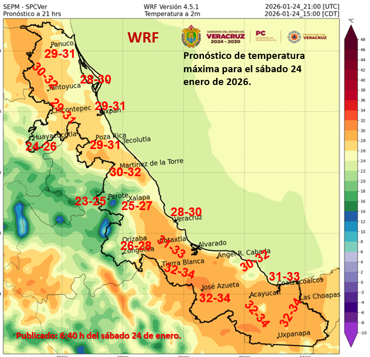 Las temperaturas máximas irán de 35 a 40 °C en Guerrero, Oaxaca (costa) y Chiapas. Las máximas de 30 a 35 °C en Tamaulipas, San Luis Potosí, Colima, Michoacán, Morelos, Puebla (suroeste), Campeche, Yucatán y Quintana Roo.
