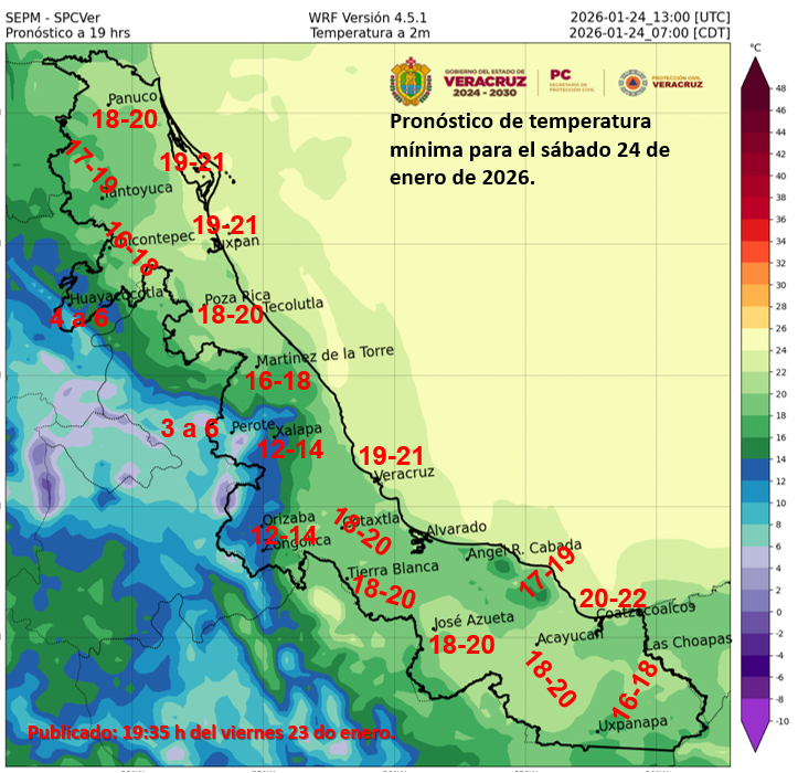 Las mínimas de -5 a 0 °C con heladas en zonas serranas de Baja California, Sonora, Coahuila, Nuevo León, San Luis Potosí, Zacatecas, Hidalgo, Estado de México, Tlaxcala, Puebla, Veracruz y Oaxaca.