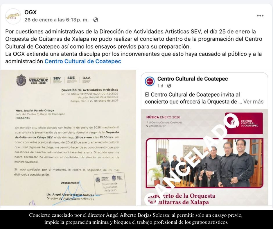 Exigen la intervención inmediata de las autoridades educativas estatales, la restitución de condiciones dignas de trabajo, la definición de una conducción institucional con perfil en gestión cultural y la reactivación plena de la producción y difusión artística en beneficio de la comunidad educativa veracruzana.