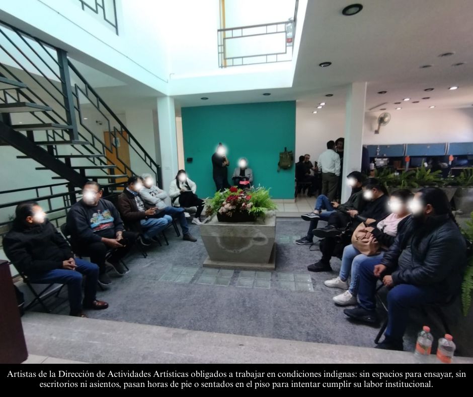 No hay equipos de cómputo, escritorios ni espacios adecuados para el desempeño profesional o la preparación artística, por lo que muchas jornadas transcurren de pie o sentados en el piso, en condiciones impropias para cualquier institución pública.