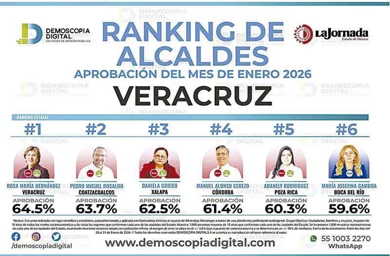 Rosa María Hernández Espejo, de Veracruz; Pedro Miguel Rosaldo, de Coatzacoalcos, y Daniela Griego Ceballos de Xalapa, son los tres mejores alcaldes del estado de Veracruz, según la casa encuestadora Demoscopia Digital. El primer lugar del ranking estatal de alcaldes correspondiente al mes de enero, lo obtuvo Rosa María Hernández Espejo, del municipio de Veracruz, […]