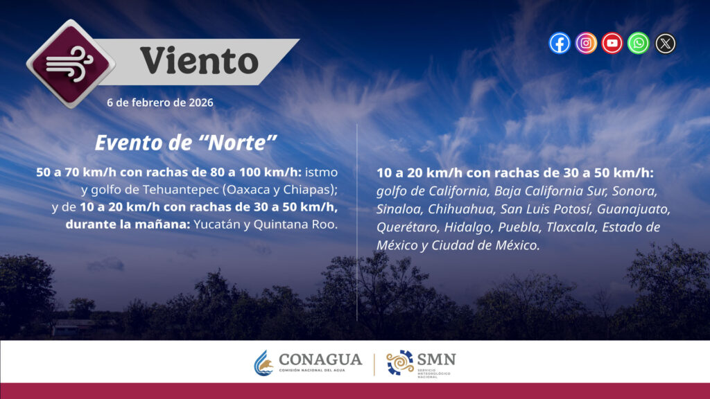 Prevé evento de “Norte” de 50 a 70 km/h con rachas de 80 a 100 km/h en el istmo y golfo de Tehuantepec (Oaxaca y Chiapas); y de 10 a 20 km/h con rachas de 30 a 50 km/h, durante la mañana en Yucatán y Quintana Roo.