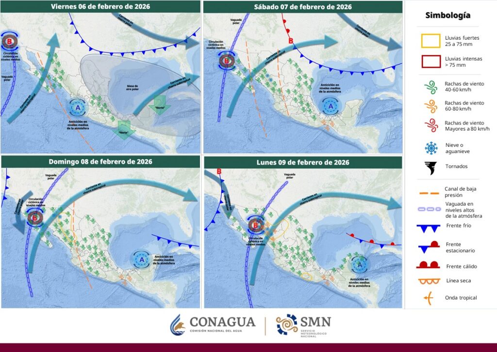 Lo anterior, con el ingreso de humedad del océano Pacífico, favorecido por la corriente en chorro subtropical, originará vientos fuertes, lluvias y chubascos en zonas del noroeste, occidente, centro y sur del territorio nacional.