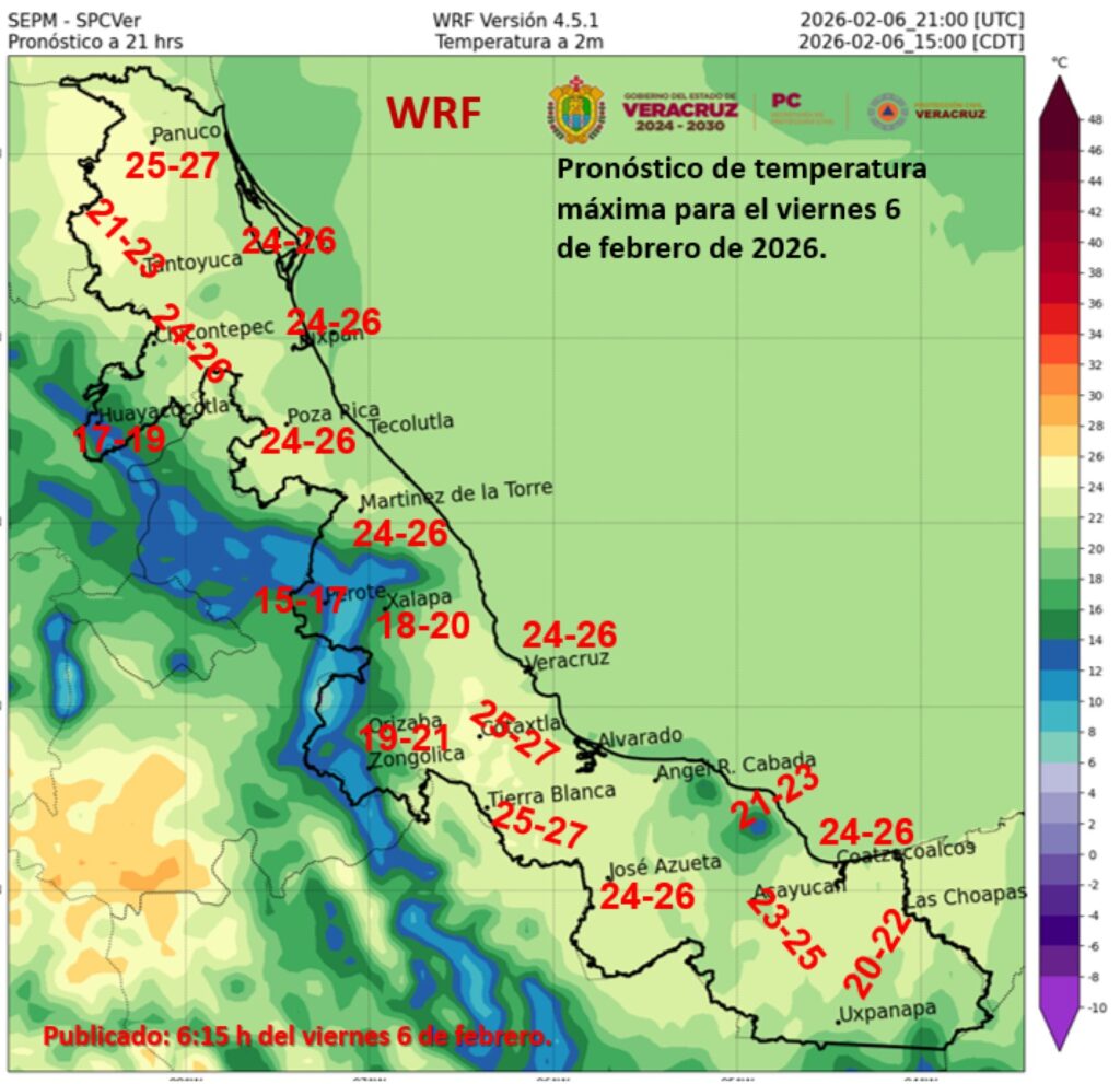 Cielo medio nublado a nublado en la región, con lluvias aisladas en Veracruz (Las Montañas, Papaloapan, Los Tuxtlas y Olmeca) y Tabasco; cielo despejado y sin lluvia en Tamaulipas. Por la mañana, ambiente fresco a templado con bancos de niebla en la región, y frío a muy frío en zonas serranas de Veracruz y Tamaulipas. Durante la tarde, ambiente templado en Veracruz y Tabasco, así como cálido en Tamaulipas. Viento de dirección variable de 10 a 20 km/h con rachas de hasta 35 km/h.