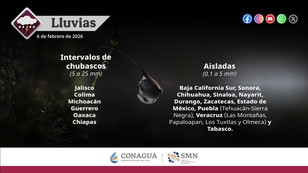 Pronostica intervalos de chubascos (de 5 a 25 mm) en Jalisco, Colima, Michoacán, Guerrero, Oaxaca y Chiapas.