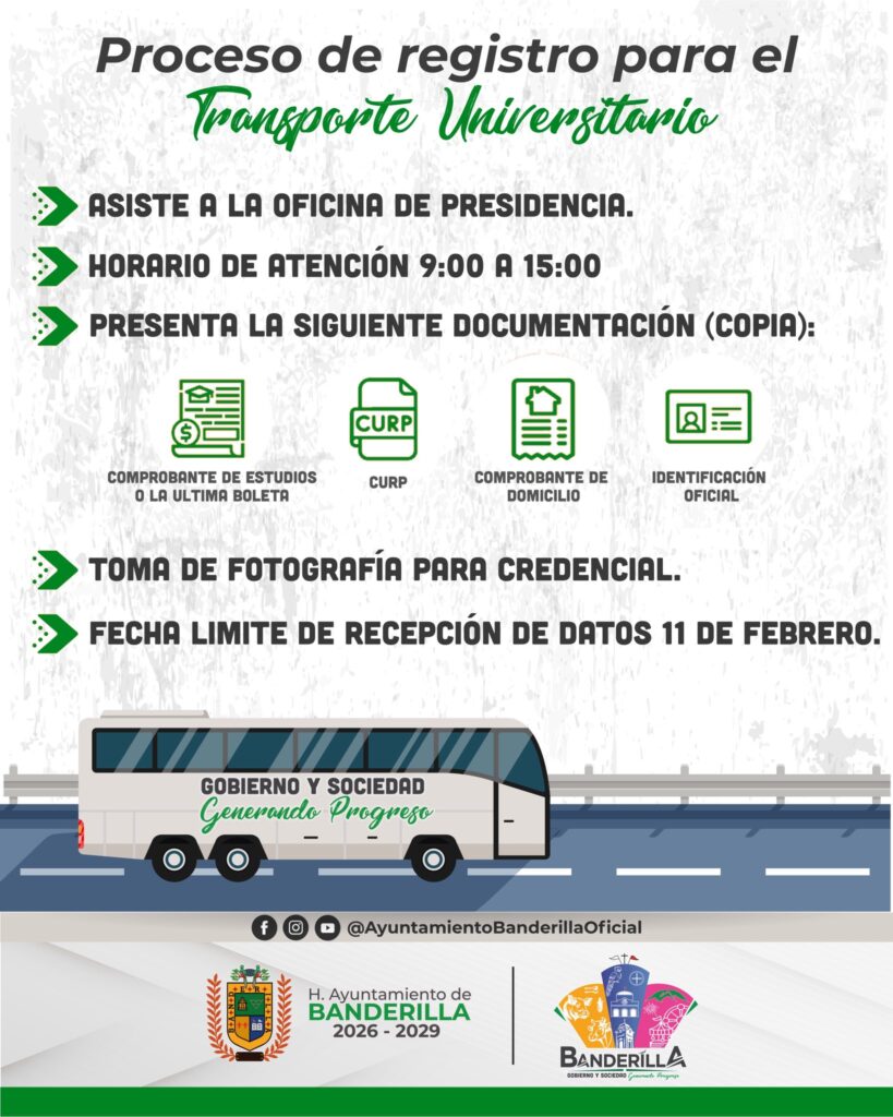 Con el propósito de impulsar la educación y apoyar la economía familiar, el gobierno municipal de Banderilla que preside José Antonio Sangabriel Fernández informó a la comunidad estudiantil que pone a su disposición un servicio de transporte universitario gratuito, a partir del lunes 9 de febrero, como una acción de gobierno implementada para apoyar con el traslado diario a la población escolar a sus respectivos centros de estudios.