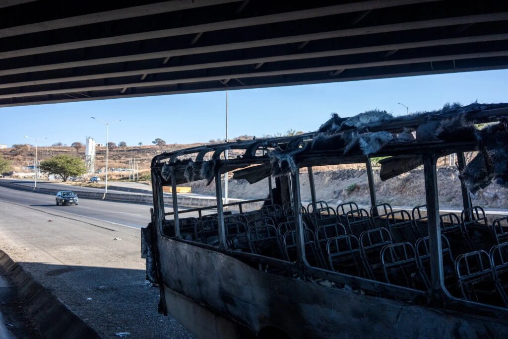 A lo largo de la autopista, cerca del aeropuerto, un autobús yacía de lado, ennegrecido y todavía oliendo a humo, un recordatorio de los bloqueos que habían paralizado la ciudad apenas unas horas antes.