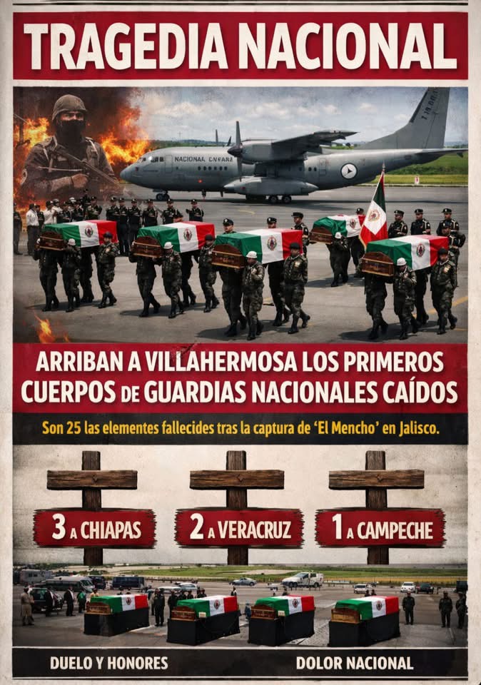 Los cuerpos de los elementos de la Guardia Nacional que perdieron la vida en cumplimiento de su deber, durante los hechos violentos registrados tras la captura de “El Mencho” en Jalisco, arribaron este miércoles al Aeropuerto Internacional de la Ciudad de Villahermosa, Tabasco, para ser trasladados a sus ciudades de origen. Se trata de los […]
